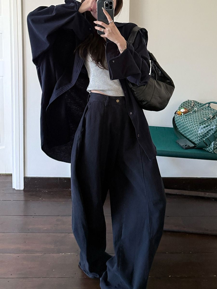 Effortlessly merging comfort and vintage style, these retro-inspired wide-leg jeans bring a timeless American workwear aesthetic to modern street fashion. Featuring a high-rise waist and lantern-style wide legs, they create a balanced silhouette that’s both flattering and laid-back.