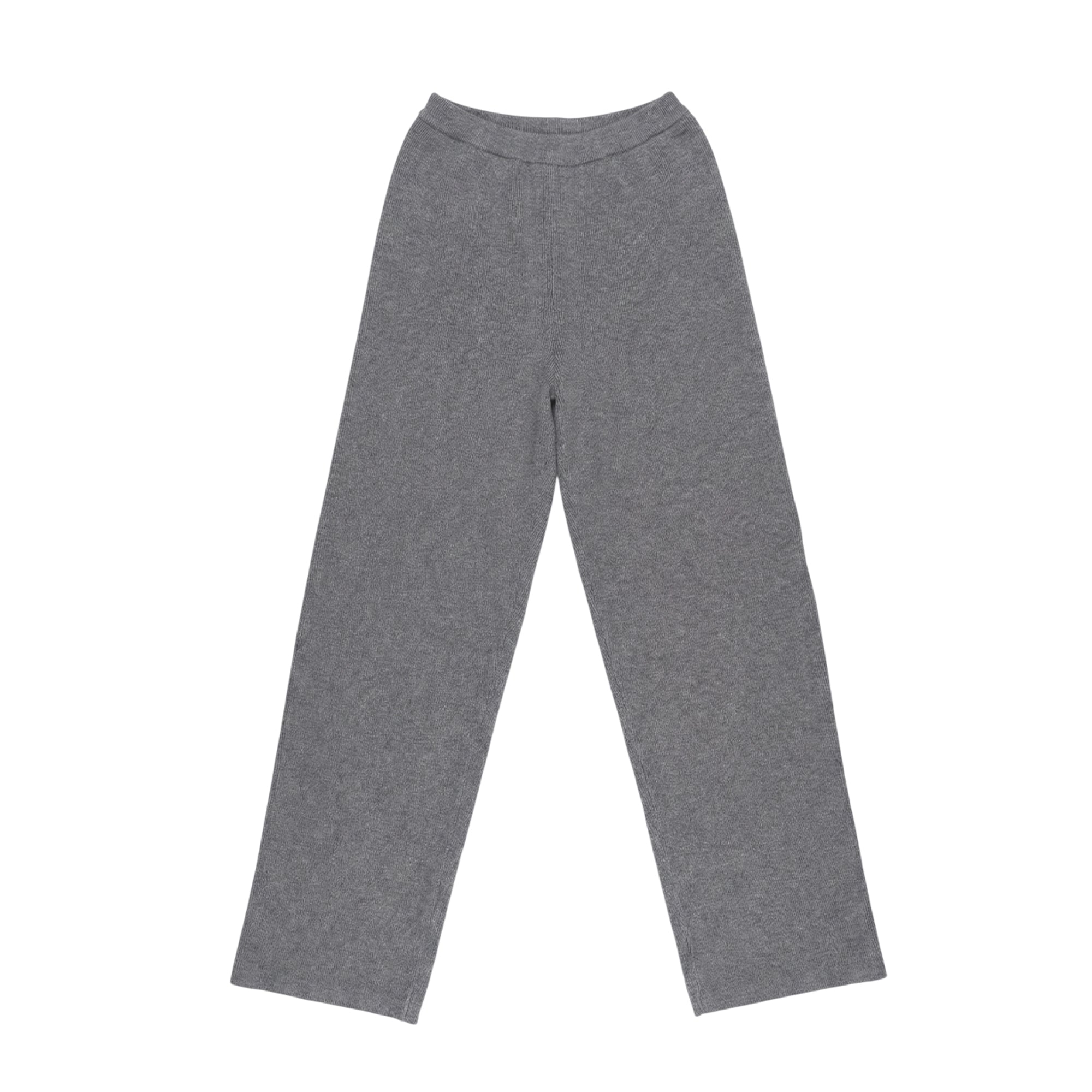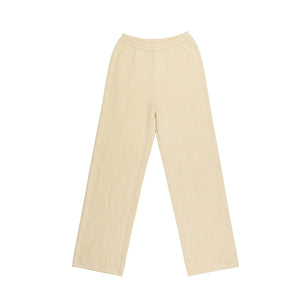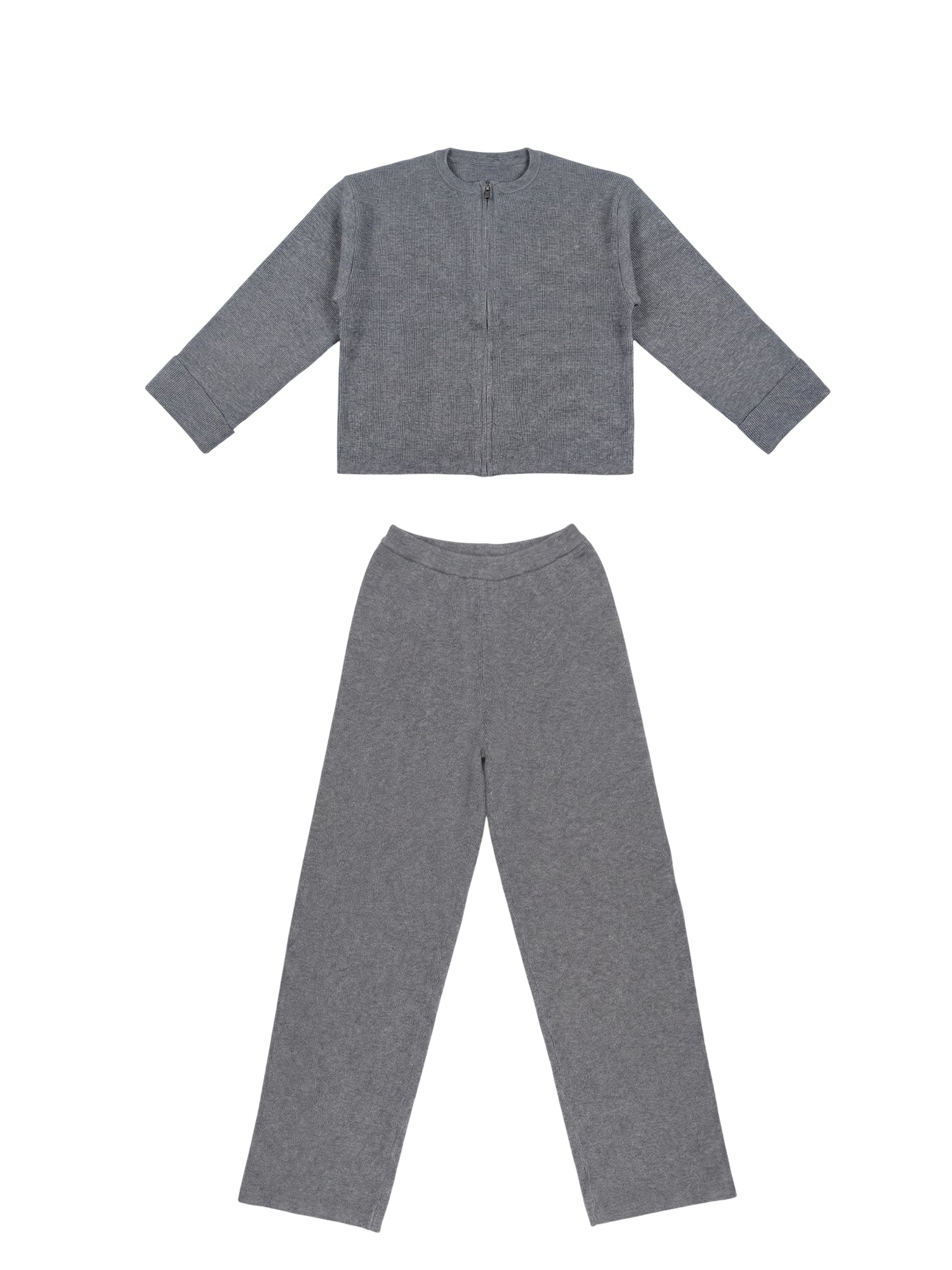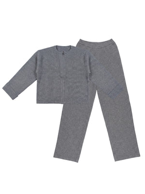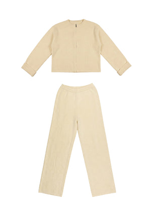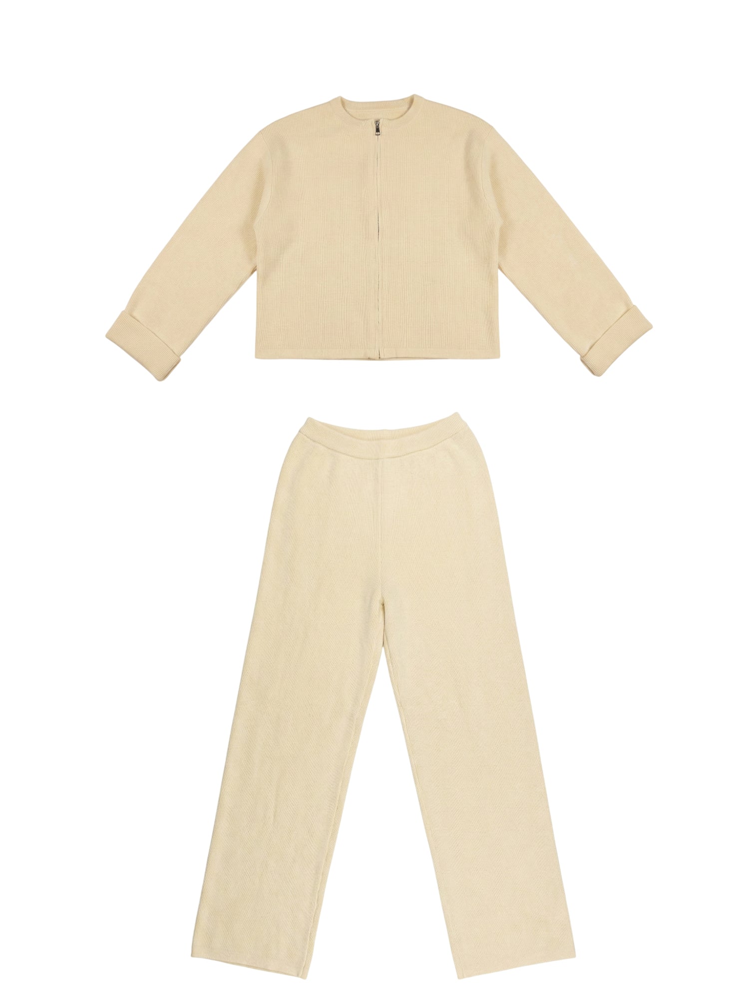 The knit fabric has a smooth, soft texture that feels comfortable against the skin and provides light warmth, making it suitable for daily wear across seasons. The jacket features subtle cuff details and a neat silhouette, while the pants offer a comfortable waistband and straight cut for effortless movement.