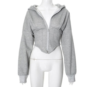 Made from a soft, thick fabric that provides both warmth and structure, it features a full front zipper, long sleeves, and a stylish hood for a versatile finish. The curved hem design enhances the figure, giving it a subtly corset-inspired shape that defines the waist while maintaining a relaxed, casual vibe.